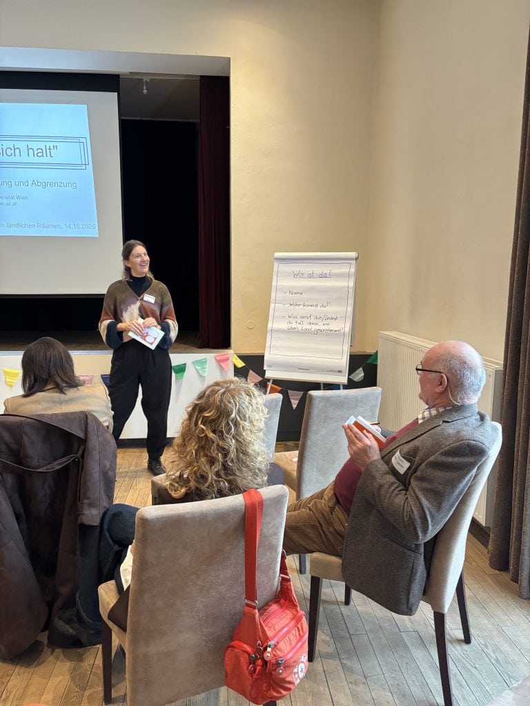Isabel Stumfol, selbstständige Schreibtrainerin, Autorin und Raumplanerin, erläuterte in einem Kurzvortrag, welche Rolle bestimmte abwertende Narrative über den ländlichen Raum spielen können und wie vermieden werden können.